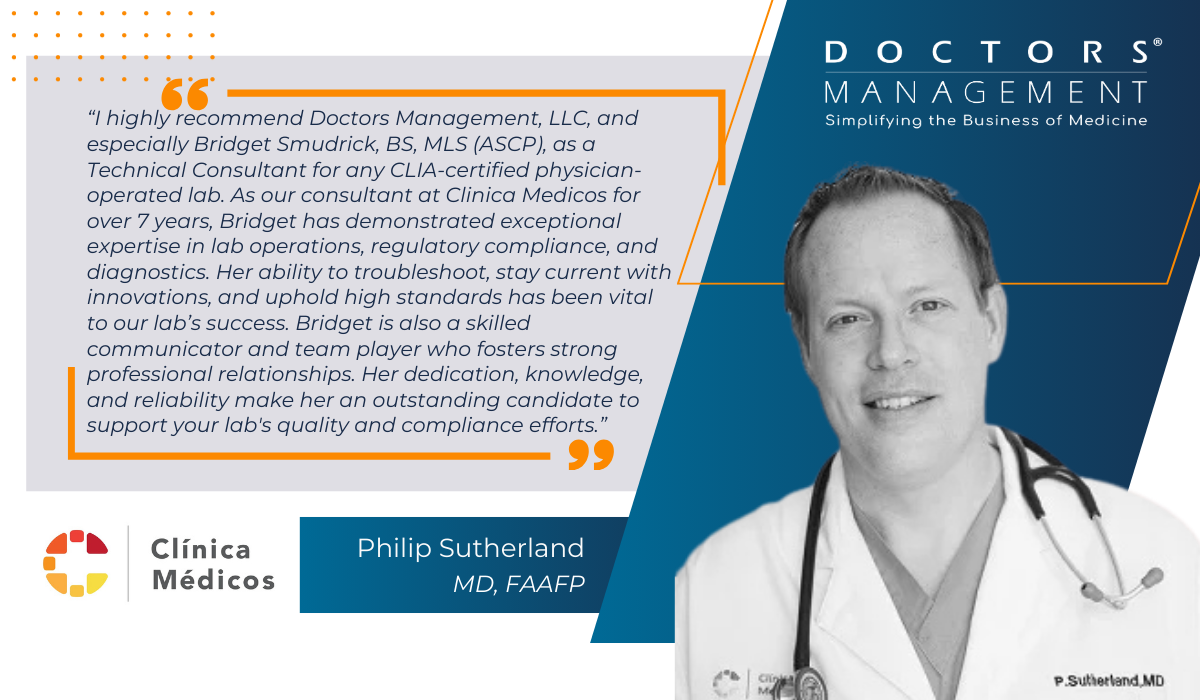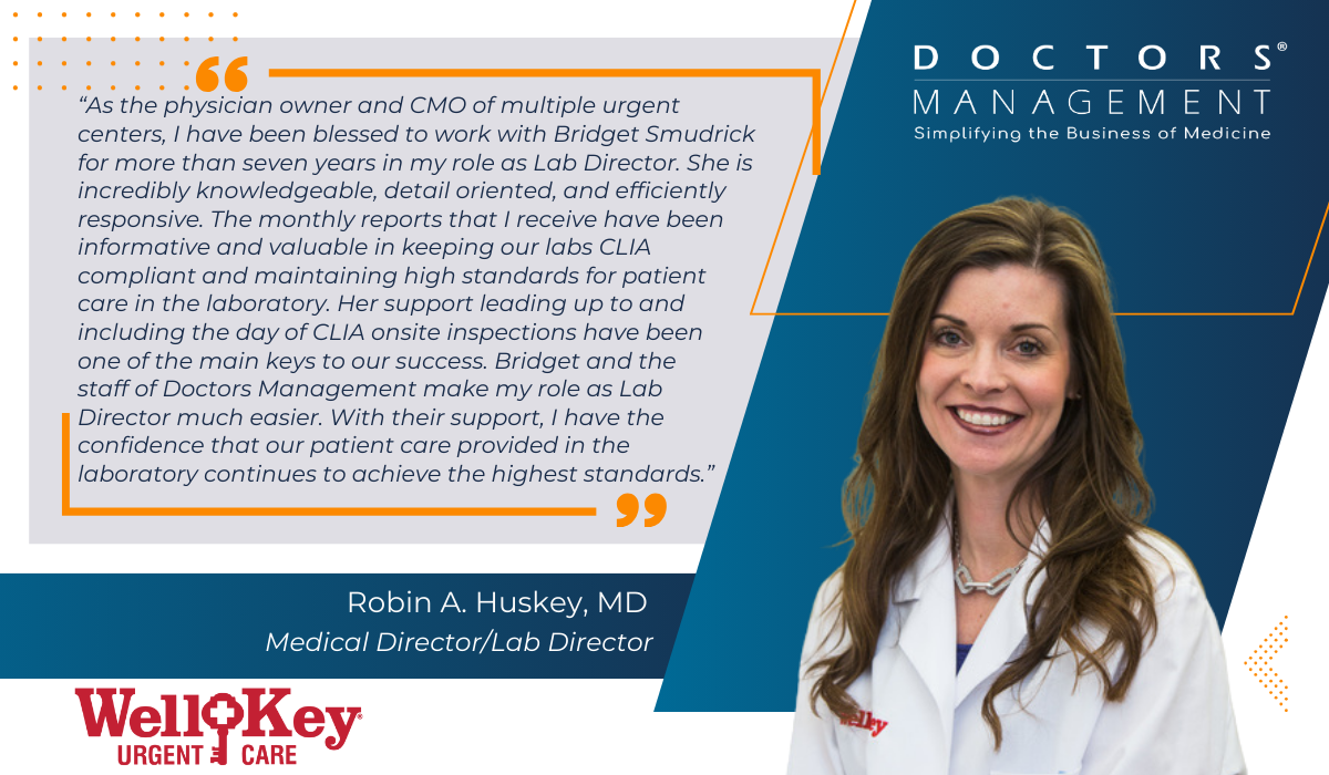 Working as a Technical Consultant and serving as the Director of CLIA Compliance with DoctorsManagement has been the greatest joy of my career. The experience I gained while working in the different laboratory environments mentioned previously created the unique set of skills and knowledge base I draw on daily while performing in my current role. The best part of my job is working one on one with clients and seeing their love for the laboratory grow.